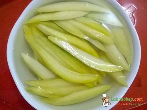 - Đầu tiên, bạn gọt xoài xanh và cắt thành các miếng dài chừng 4 cm. Bạn đừng cắt mỏng quá vì xoài mềm mà cắt mỏng sẽ bị nát nhé. Rồi bạn ngâm vào một chậu nước cho ít muối. Ngâm khoảng 30 phút thì cho ra để ráo.