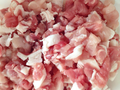 Bước 1: Thịt nạc, mỡ thái hạt lựu cho vào tủ đá 1 tiếng trước khi xay.