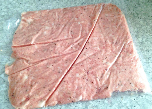 - Hỗn hợp thịt lúc này đã khá dẻo và mịn. Cho thịt vào túi nilon, dàn mỏng thịt cho vào tủ đá ít nhất 3 tiếng.