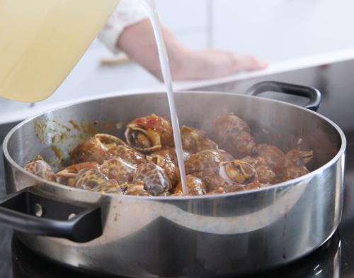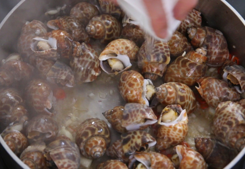 Sau đó cho ốc vào xào từ 4-5 phút. Thêm rượu nấu ăn, rượu gạo, rượu vang vào.