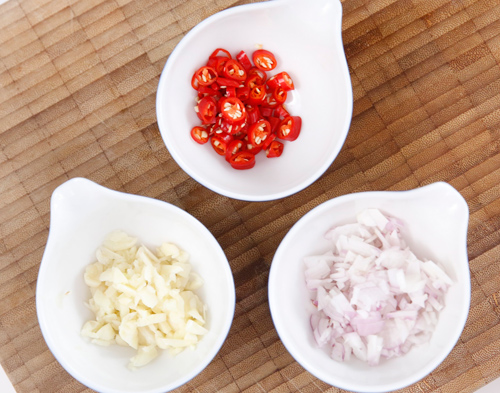 Hành khô bóc vỏ, thái nhỏ. Tỏi băm nhỏ. Ớt thái nhỏ.