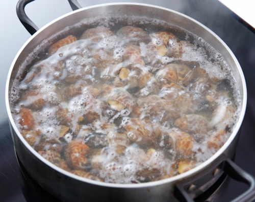 Đun sôi một nồi nước, cho ốc vào luộc trong 5 phút sau đó vớt ra. Rửa lại bằng nước lạnh.