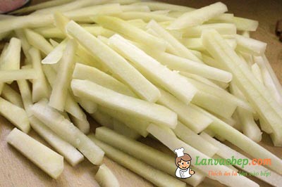 - Từ phần vỏ bưởi, bạn cắt đi phần vỏ xanh cứng bên ngoài chỉ giữ lại phần cùi trắng giữa phần ruột và phần vỏ xanh bên ngoài. Sau đó bạn thái con chì dài chừng 3 cm là được.