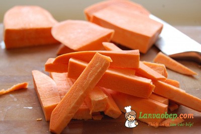 Khoai lang bạn nạo sạch lớp vỏ bên ngoài và cho vào một chậu nước muối. Làm như vậy để khoai lang không bị thâm. Dùng dao cắt khoai lang thành các miếng mỏng dày chừng 0.3 – 0.5 cm. Nếu bạn cắt dày quá thì quá trình ngâm đường sẽ lâu hơn. Bạn rửa lại với nước khoảng 3 lần cho bớt nhựa khoai lang.